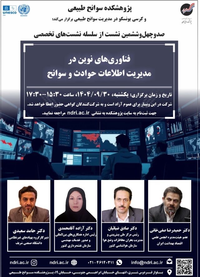 نشست فن آوری نوین در مدیریت اطلاعات حوادث وسوانح ۳۰ آذر ۱۴۰۴ | ۱۲:۰۴ کد : ۵۷۱۴۹ اطلاعیه ارسال به دیگران نام شما ایمیل شما ایمیل دریافتکننده ارسال انصراف تعداد بازدید:۷۷ دعوتنامه نشست فن آوری نوین در مدیریت اطلاعات حوادث وسوانح